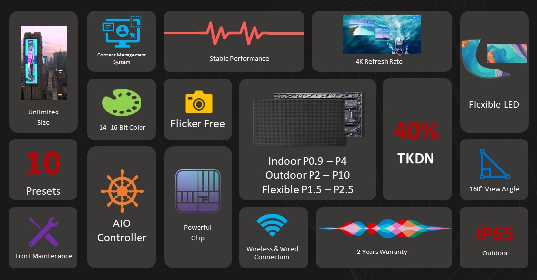 Full indoor service cabinet design, attach on the wall without space, LED outdoor has a higher light brightness level and has good resistance to various weather conditions, & LED Flexible High Performance LED Display, Ultra-Slim and Light Weight, Superior Image Quality.